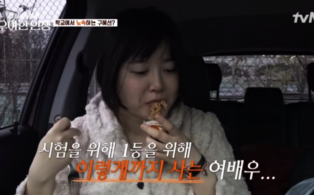 Cụ thể, trong một chương trình của đài tvN lên sóng ngày 16/5 vừa qua, Goo Hye Sun gây sốc khi cho biết bản thân đã tiêu tốn quá nhiều tài sản của mình trong suốt khoảng thời gian vướng lùm xùm đời tư sau đó là đột ngột tuyên bố giải nghệ. Cô chia sẻ việc đi học diễn xuất vì vậy cũng trở nên khó khăn khi cô "gần như là người vô gia cư". Trong chương trình, Goo Hye Sun đã tiết lộ bức hình chụp trên xe hơi, khi cô phải ngủ và ăn mì ngay trên chiếc xe của mình, tại bãi đỗ xe của ngôi trường mà cô theo học diễn xuất. Thậm chí, trên chiếc xe này còn được trang bị sẵn một số nhu yếu phẩm như khăn ướt để rửa mặt vào buổi sáng và dầu gội khô, phục vụ cho việc chỉnh trang trước khi vào học.