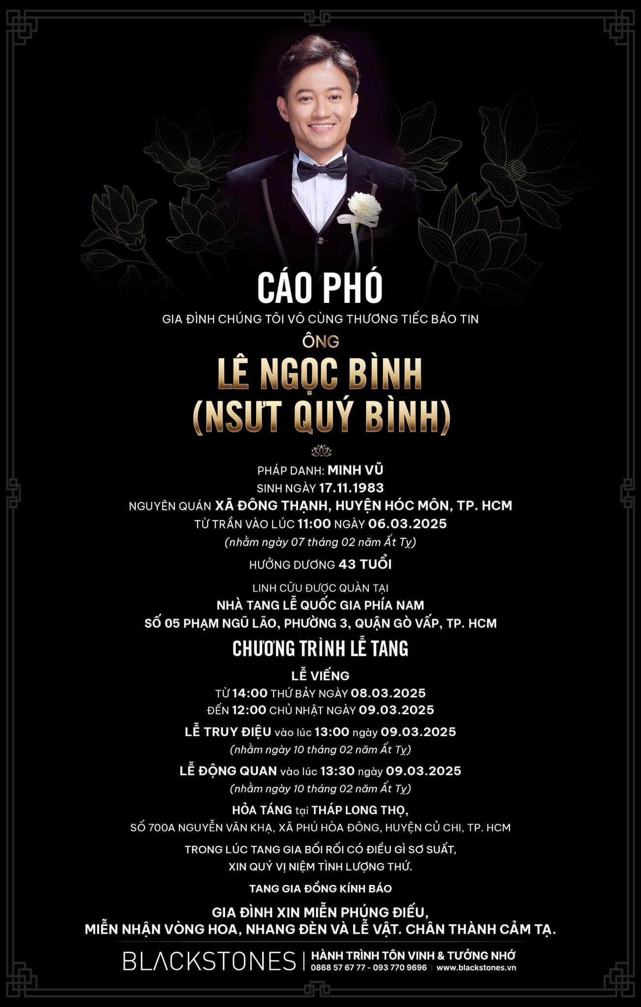 Gia đình thông báo không nhận phúng điếu, vòng hoa hay lễ vật, chỉ xin ghi nhận tấm lòng của những người yêu quý Quý Bình.