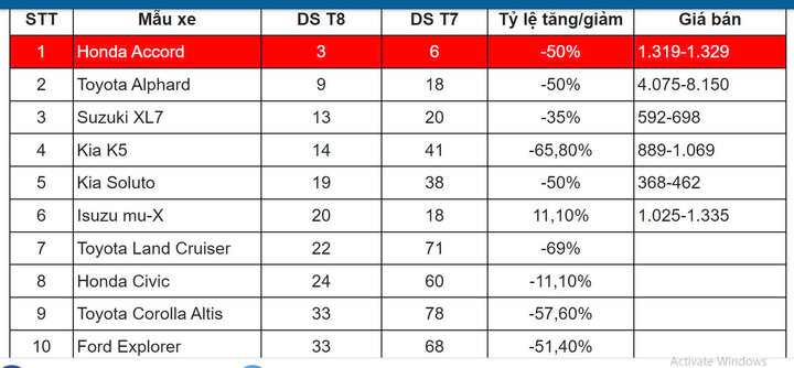 Honda Accord tiếp tục dẫn đầu danh sách xe bán chậm nhất tháng khi chỉ bán được 3 xe, giảm 50% so với tháng 7 (6 xe). Dù đã giảm giá 220 triệu đồng, mẫu sedan cỡ D này vẫn không thu hút được người mua. Doanh số lũy kế 8 tháng của Honda Accord đạt 57 xe, tăng 83,9% so với cùng kỳ năm ngoái.
