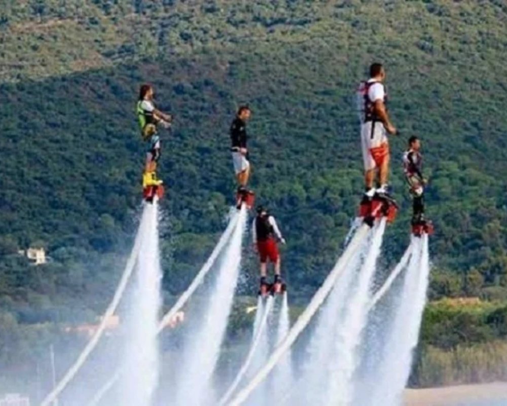 Fly-board hay còn được gọi là môn đứng nước được phổ biến khá nhiều ở nước ngoài nhưng chỉ mới du nhập vào Việt Nam thời gian gần đây. Thiết bị này sẽ dùng một động cơ phản lực hút nước mạnh mẽ và đẩy ra với áp suất cực cao, tạo một lực để nâng người sử dụng lên không trung từ 6 – 9m.