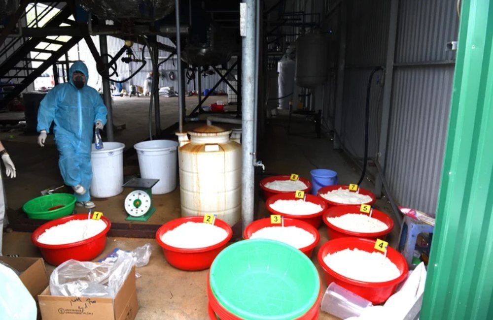 Trước thời điểm phá án khoảng 1 tuần, ban chuyên án xác định các đối tượng đã sản xuất 1,8 tấn nguyên liệu để làm ra ma túy, đóng vào 27 thùng xốp rồi gửi vào các kho đông lạnh ở xa nhà xưởng. Khi chủ nhà kho đông lạnh không tiếp nhận, những kẻ này lại đưa về và đốt vỏ thùng.