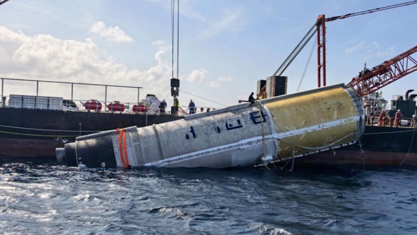 Tầng đẩy tên lửa Long March 10 được cần cẩu đưa lên tàu sau khi hạ cánh xuống Biển Đông. (Nguồn: CCTV)
