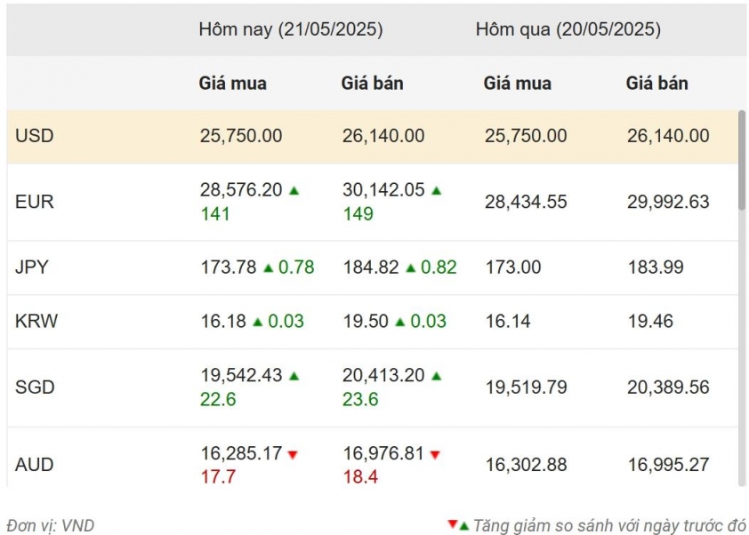 Nhìn chung, trong phiên giao dịch ngày 21/05/2025, phần lớn các đồng ngoại tệ đều tăng giá so với VND, ngoại trừ đồng AUD. Điều này phản ánh diễn biến tích cực của các đồng tiền mạnh trên thị trường quốc tế trong bối cảnh biến động kinh tế toàn cầu vẫn tiếp diễn.