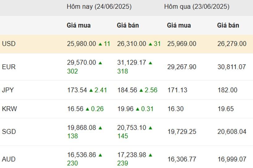 Nhìn chung, trong phiên giao dịch ngày 24/06/2025, phần lớn các đồng ngoại tệ đều tăng giá so với VND. Điều này phản ánh diễn biến tích cực của các đồng tiền mạnh trên thị trường quốc tế trong bối cảnh biến động kinh tế toàn cầu vẫn tiếp diễn.