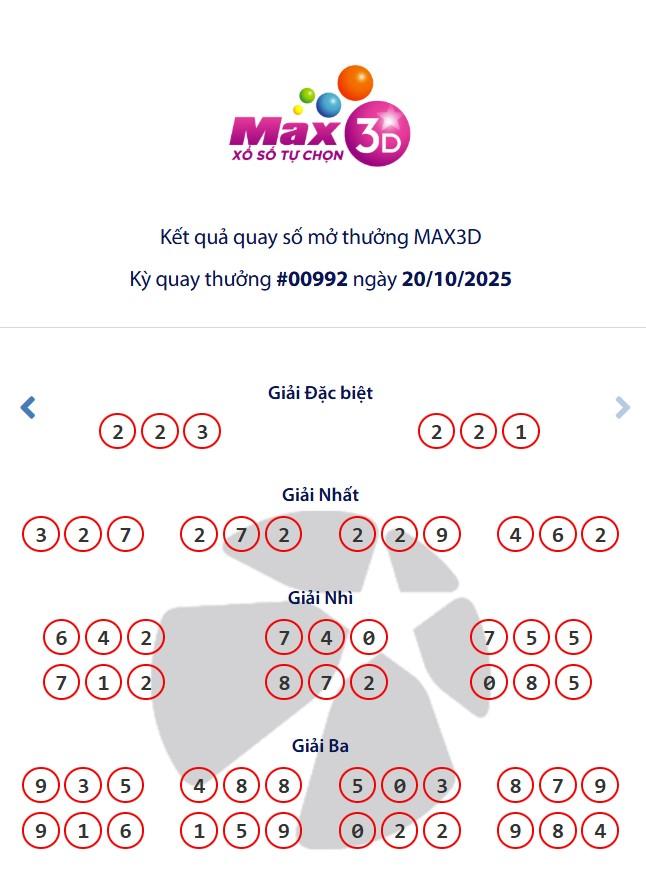 Xổ số Vietlott ngày 20/10/2025 - Cập nhật Kết quả Vietlott 20/10/2025 giải Vietlott Max 3D nhanh nhất và chính xác nhất.