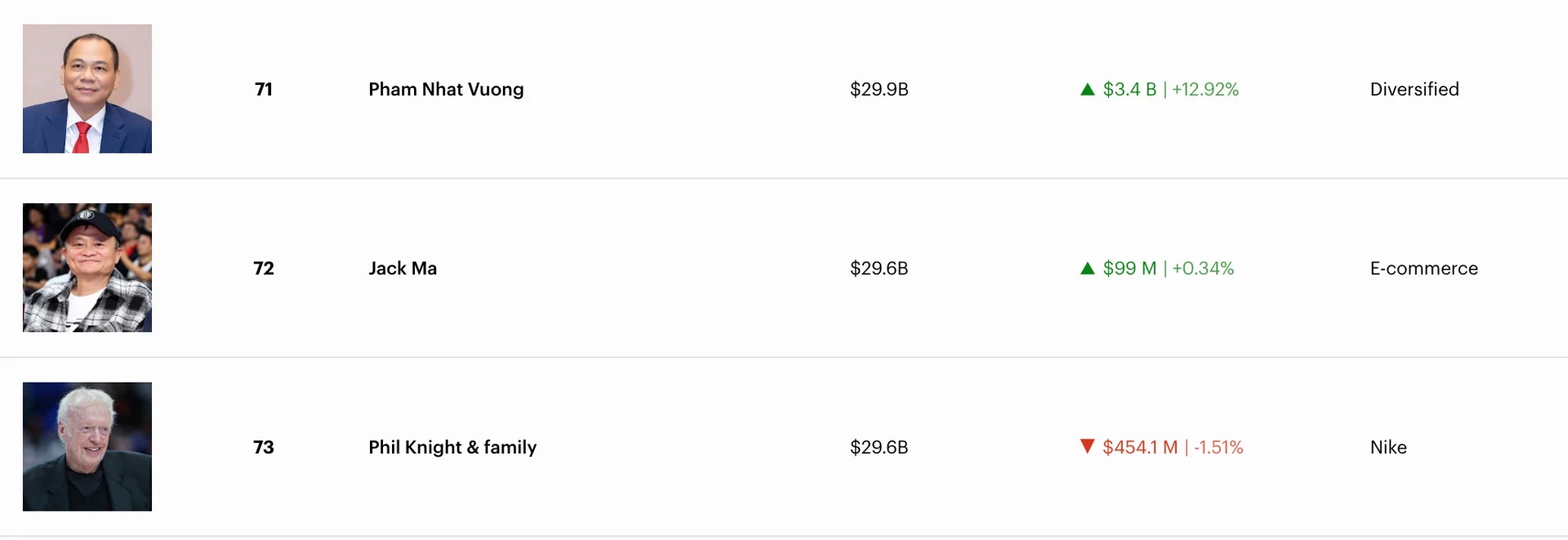Sau khi lọt top 100 người giàu nhất thế giới theo xếp hạng Forbes Real-Time Billionaires, theo cập nhật vào chiều 23/12/2025, ông Phạm Nhật Vượng đã vươn lên vị trí thứ 71, vượt mặt các tỷ phú nổi tiếng như Jack Ma (Trung Quốc), Phil Knight và gia đình (nhà đồng sáng lập Nike),… Với khối tài sản 29,9 tỷ USD, ông Vượng hiện đang xếp sau bà MacKenzie Scott, vợ cũ của tỷ phú Jeff Bezos (30,1 tỷ USD).