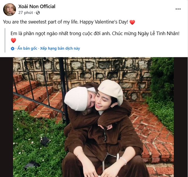 Chiều Valentine 14/2, Xoài Non khiến dân tình "tan chảy" khi đăng khoảnh khắc hôn má Gil Lê tình tứ kèm lời nhắn gửi ngọt ngào: "You are the sweetest part of my life. Happy Valentine’s Day!" (Tạm dịch: Anh là phần ngọt ngào nhất trong cuộc đời em. Chúc mừng ngày lễ Tình Nhân).