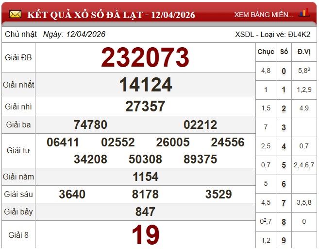 Theo dõi kết quả xổ số Đà Lạt hôm nay 19/4/2026 nhanh chóng và chính xác nhất để không bỏ lỡ thời gian nhận thưởng.