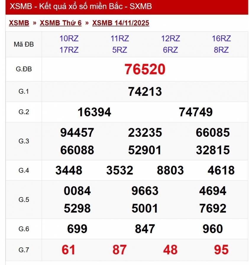 Cập nhật Kết quả xổ số miền Bắc hôm nay 14/11/2025 - XSMB 14/11/2025 nhanh nhất và chính xác nhất.