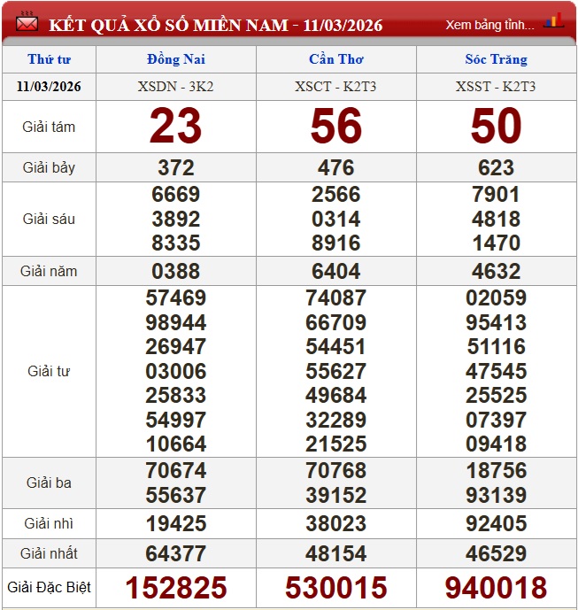 Kết quả xổ số miền Nam ngày 11/3/2026