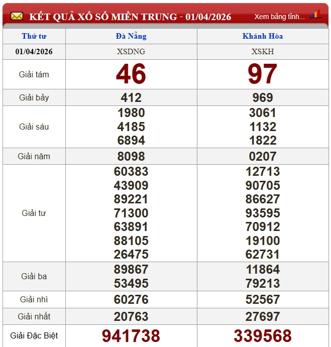 Kết quả xổ số miền Trung (XSMT) hôm nay ngày 1/4
