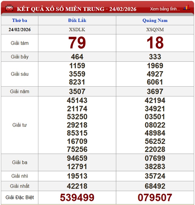 Kết quả xổ số miền Trung ngày 24/2/2026