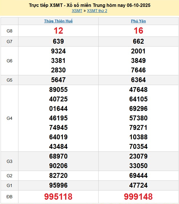 Kết quả xổ số miền Trung (XSMT) hôm nay ngày 6/10